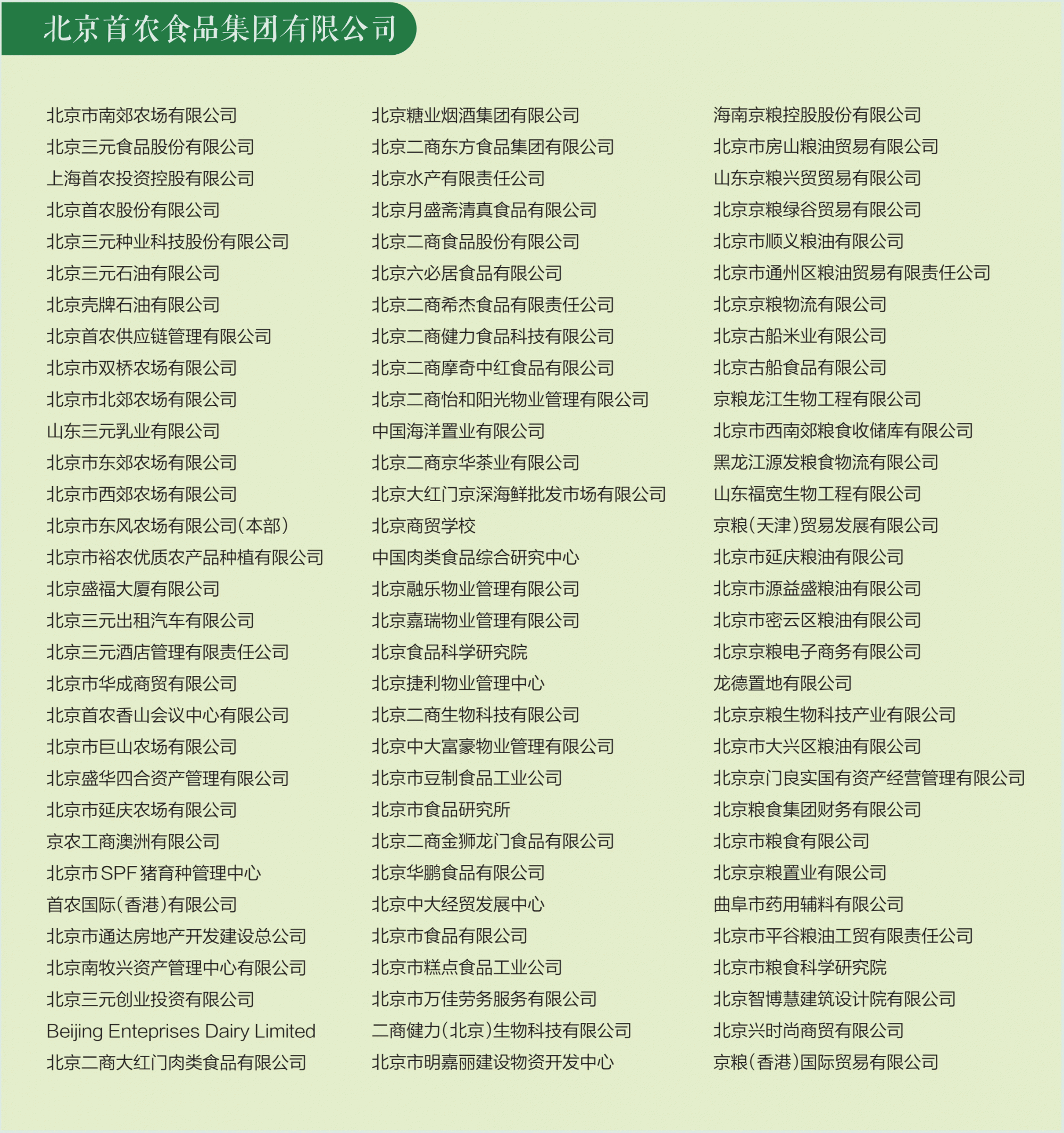 北京首農(nóng)食品集團(tuán)是經(jīng)北京市委、市政府批準(zhǔn),于2017年12月由首農(nóng)集團(tuán)、京糧集團(tuán)、二商集團(tuán)三家市屬企業(yè)聯(lián)合重組成立的。集團(tuán)資產(chǎn)、營(yíng)收雙超千億,員工近6萬(wàn)人,所屬企業(yè)500余家,其中中外合資合作企業(yè)30余家,境外公司10余家,上市公司2家,農(nóng)業(yè)產(chǎn)業(yè)化國(guó)家重點(diǎn)龍頭企業(yè) 8 家,位列中國(guó)企業(yè)500強(qiáng),是首都食品供應(yīng)保障服務(wù)的重要載體。集團(tuán)產(chǎn)業(yè)橫跨農(nóng)牧漁業(yè)、食品加工業(yè)、商貿(mào)服務(wù)與物產(chǎn)物流業(yè),覆蓋米面油、肉蛋奶、醬醋茶、糖酒菜等全品類(lèi)食品,涉及種植、養(yǎng)殖、倉(cāng)儲(chǔ)、加工、貿(mào)易、配送、銷(xiāo)售等各個(gè)環(huán)節(jié),形成從田間到餐桌的全產(chǎn)業(yè)鏈條和一二三產(chǎn)融合發(fā)展的全產(chǎn)業(yè)格局。