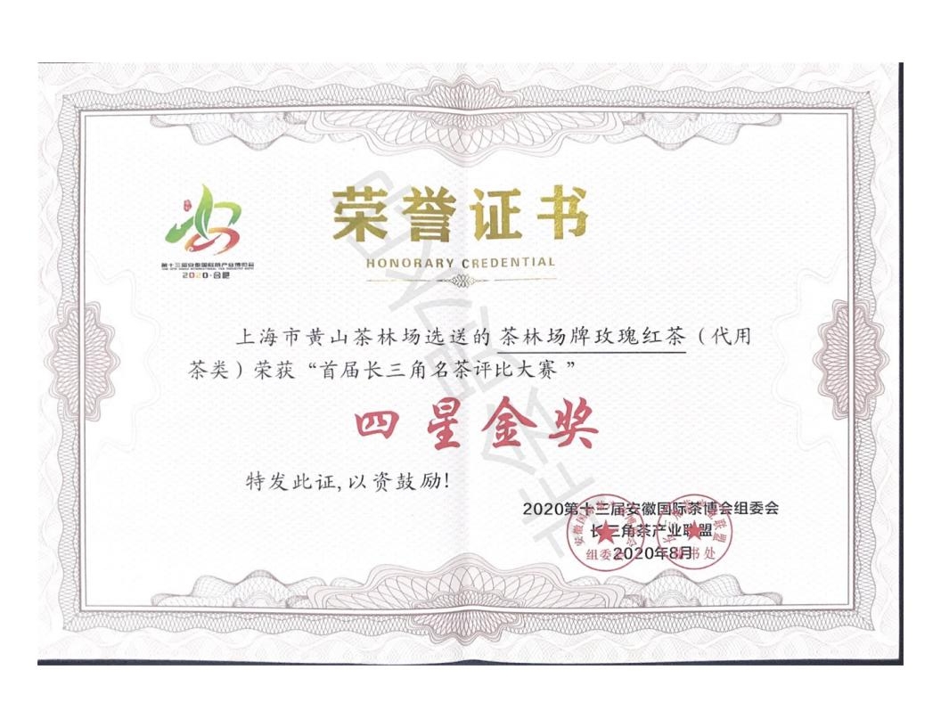 證書介紹 上海市黃山茶林場(chǎng)選送的茶林場(chǎng)牌玫瑰花茶(代用茶類)榮獲“首屆長(zhǎng)三角名茶評(píng)比大賽”四星金獎(jiǎng) 證書圖片 |