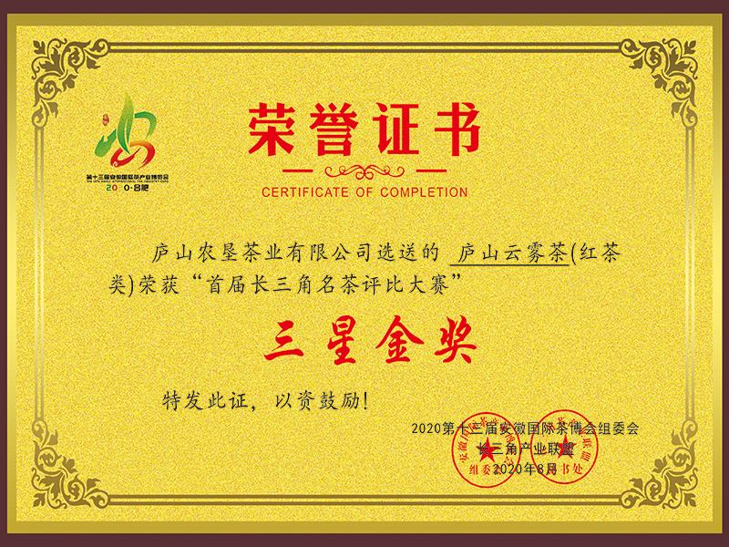 廬山農墾茶業有限公司選送的 廬山云霧茶(紅茶類)榮獲首屆長三角名茶評比大賽 三星金獎