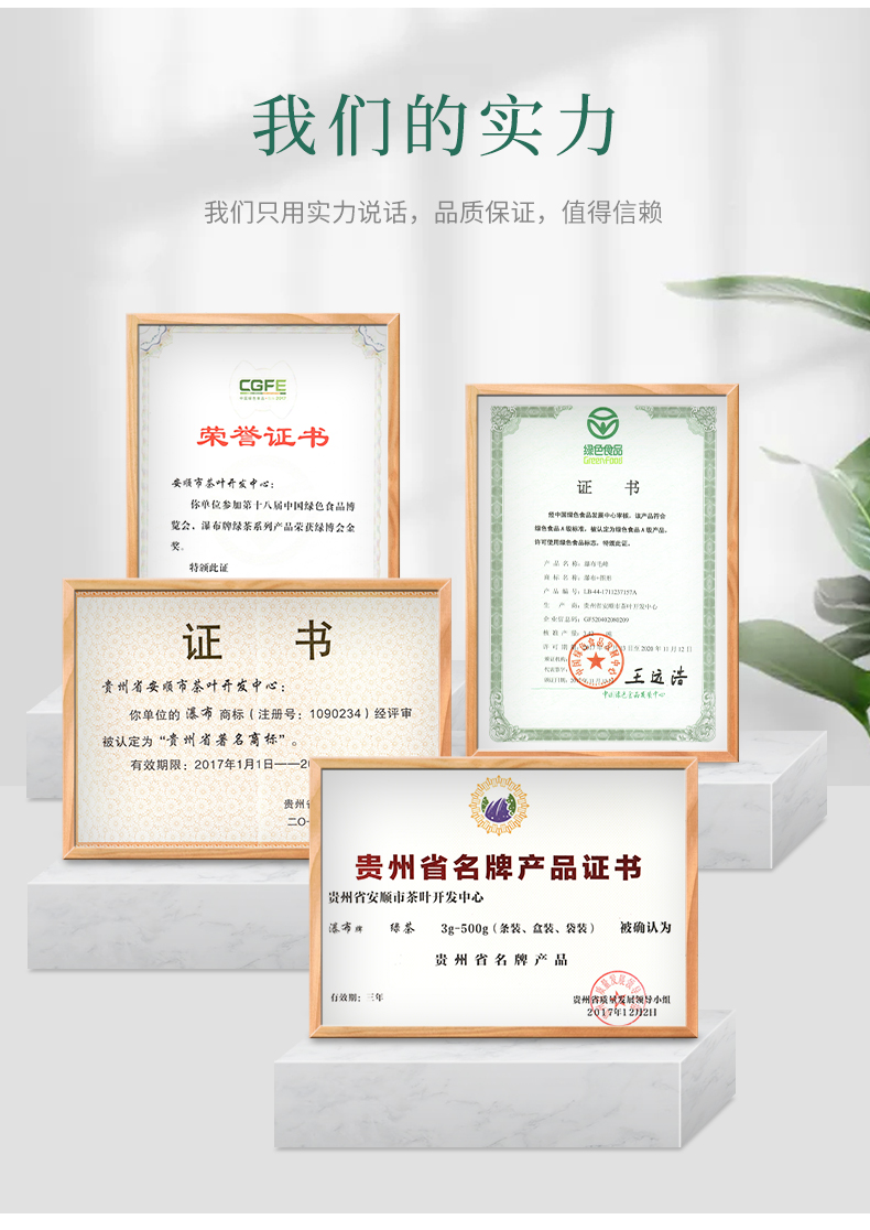 瀑布茶品牌是安順市人民政府主打茶葉品牌,省級重點打造區(qū)域公共品牌,屬貴州五大名茶,先后獲得獲“中國農產品區(qū)域公用品牌”、“貴州省著名商標”、“貴州省名牌產品”等榮譽稱號。近年來,在各級部門大力推動下,瀑布茶品牌不斷發(fā)展壯大。截止目前,現(xiàn)有瀑布茶品牌加盟企業(yè)23家,輻射茶園面積200000余畝,其中綠色食品認證茶園基地面積7000余畝,有機食品認證基地面積2500畝。擁有“瀑布毛峰”、“瀑布翠芽”、“瀑布紅茶”、“瀑布翠龍”等產品,多次獲得“中綠杯”、“中茶杯”、“華茗杯”等大獎;分別榮獲第14屆中國國際農產品交易會金獎、第18屆中國綠色食品博覽會金獎、“黃山杯”首屆全國傳統(tǒng)名茶產品質量特別金獎、安順十大旅游商品等殊榮及稱號。