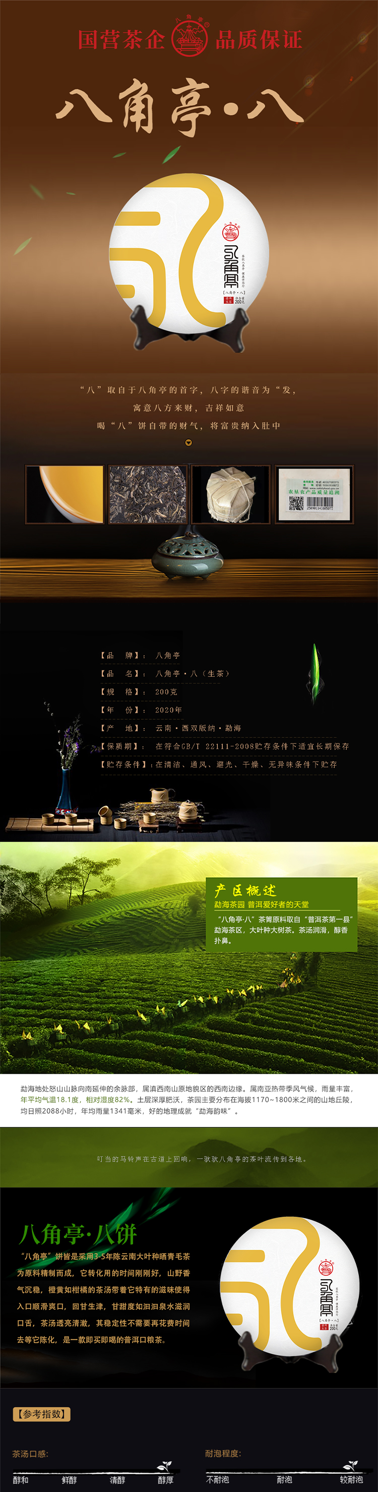 云墾茶業(yè)集團(tuán)下屬茶葉生產(chǎn)企業(yè)——云南農(nóng)墾集團(tuán)勐海八角亭茶業(yè)有限公司原名黎明茶廠,是我國歷史最為悠久的茶企之一,曾位列“中國普洱茶十大知名品牌”“十大最受歡迎茶葉品牌”、“中國普洱茶十大暢銷品牌”中,成為今天市場(chǎng)上最有影響力的品牌之一。公司產(chǎn)品獲得“綠色食品”、ISO9001、 HACCP和云茶品牌(YC)4項(xiàng)認(rèn)證,連續(xù)獲得“云南名牌農(nóng)產(chǎn)品”“云南名牌產(chǎn)品”“云南省著名商標(biāo)”等品牌榮譽(yù),公司生產(chǎn)的多款普洱茶在歷次專業(yè)評(píng)比中多次獲得特等金獎(jiǎng)和金獎(jiǎng)。在2018第五屆中國企業(yè)五星品牌論壇上,云南農(nóng)墾集團(tuán)勐海八角亭茶業(yè)有限公司上榜中國普洱茶行業(yè)影響力品牌——“金芽獎(jiǎng)”,公司負(fù)責(zé)人陳勝軍先生獲“陸羽獎(jiǎng)”,被授予2017“國際十大杰出茶人”榮譽(yù)稱號(hào)。