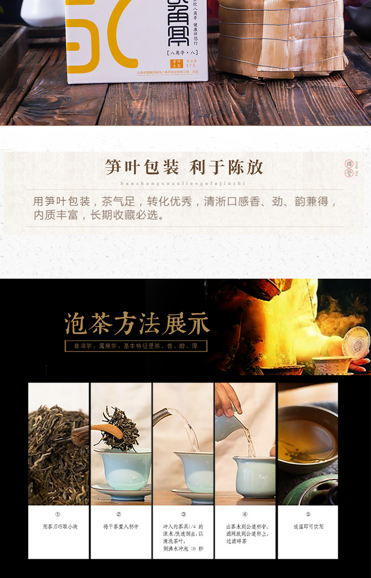 八角亭茶業(yè)原為黎明農(nóng)工商聯(lián)合公司(黎明農(nóng)場(chǎng))下屬茶葉加工組,始于一九六四年,從事茶葉產(chǎn)品開發(fā)生產(chǎn)五十余載,一九八四年建成標(biāo)準(zhǔn)化工廠,二00一年開始生產(chǎn)普洱茶,截止到2013年,公司累計(jì)生產(chǎn)各種普洱茶數(shù)百個(gè)品種共12000余噸。