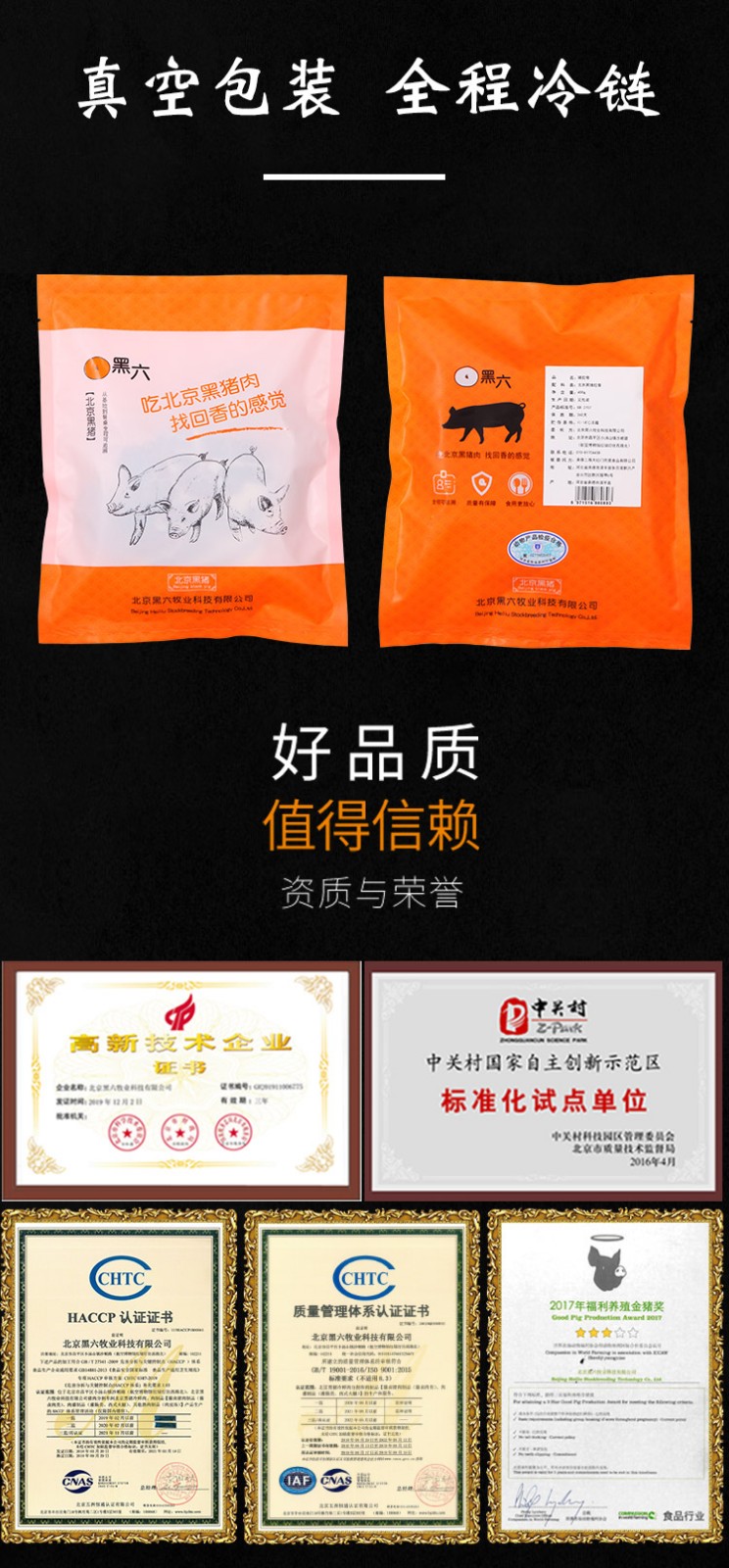 公司利用北京黑豬自有知識(shí)產(chǎn)權(quán),通過(guò)科技支撐,建立了從基地到餐桌的安全、優(yōu)質(zhì)食用農(nóng)產(chǎn)品加工的全程可追溯體系,“黑六”高品質(zhì)豬肉受到廣大消費(fèi)者關(guān)注和接受。隨著北京黑豬全產(chǎn)業(yè)鏈的延伸和發(fā)展,公司獨(dú)創(chuàng)的“黑六”品牌日益受到消費(fèi)者青睞。“黑六”產(chǎn)品通過(guò)超市專賣、直銷、電商、餐飲等渠道步入了千家萬(wàn)戶。被淡忘和追尋的肉嫩味美的北京黑豬肉通過(guò)黑六團(tuán)隊(duì)的精心打造,再度成為消費(fèi)者舌尖上的享受、餐桌上的靚麗一景。